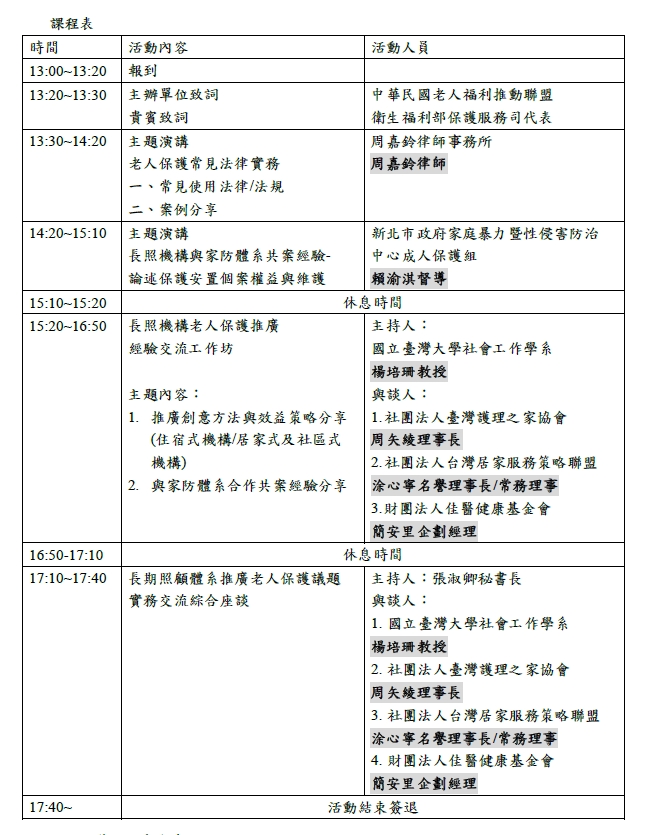 歡迎歷屆種子師資、參訓學員及關注老人保護推廣的公私部門夥伴一起與會交流!