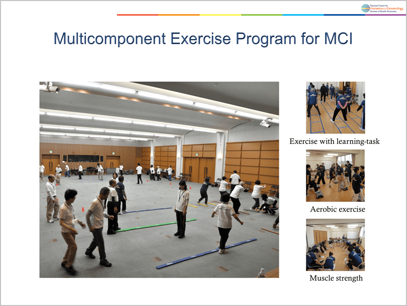 - 當這些人被確定有輕度認知功能障礙(Mild Cognitive Impairment,簡稱 MCI),NCGG 即提供認知練習:請他們一邊運動、一邊算數或講出蔬菜名稱;這種動身體又動腦的「雙重練習」(dual test),對於提升 MCI 者的認知能力非常有效。此外,還給予有氧運動、肌力鍛鍊,用多元的運動組合來預防失智症。