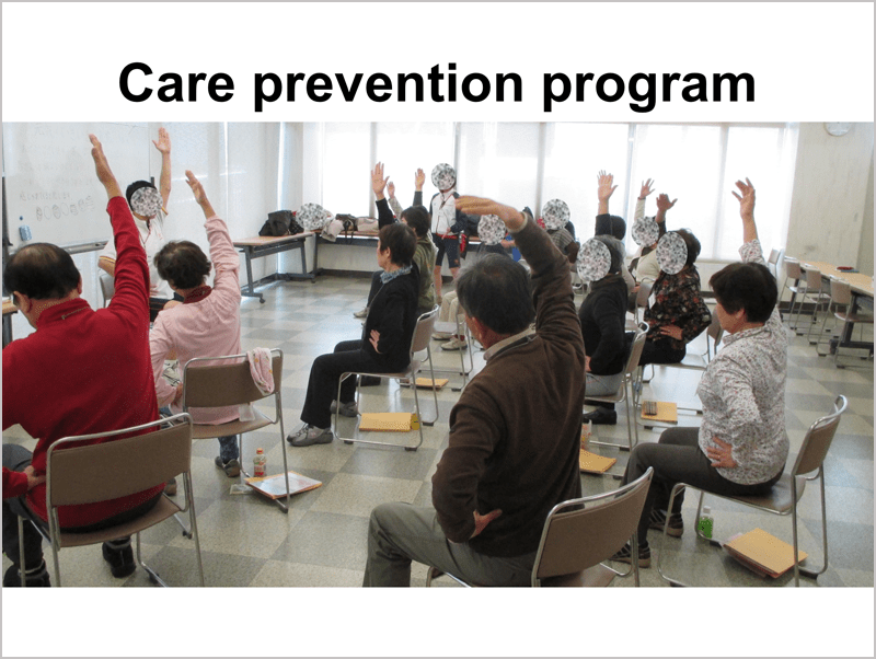 NCGG 依據基本評估量表的回覆,邀請已出現衰弱症訊號的長輩加入運動預防計畫,由物理治療師或體適能教練帶領,全程共 24 週,每週 3 次、每次 90 分鐘,從暖身操開始,接著做輕度有氧運動、漸進式肌力訓練、伸展與平衡運動再到緩和操。一年後,有參加運動預防計畫的實驗組確實能改善衰弱症狀,而沒做運動的因年齡增加更形嚴重,一來一往,相當於對長照保險服務需求降低 50%,失能率下降 50% 以上;換算醫療成本,2 年內可省下將近 4 千萬日圓。更好的是,這套從自我檢測到運動改善衰弱、降低醫療支出的方法,在小型社區就能做,不受區域限制。