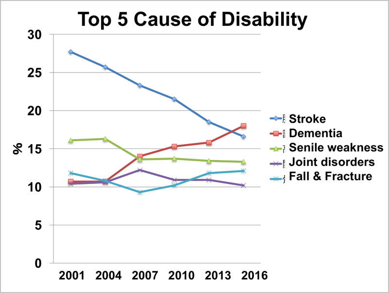 在上個世紀後期,老人失能(disability)原因排名第一的是心血管疾病,達總數 40% 以上;進入 21 世紀,起初是中風領先,經過血壓控制以及降低鹽份攝取的控管以後,一路由近 28% 降至 17%,成效明顯,可是失智症卻從 10% 急升至 18%,到 2016 年已經和中風發生黃金交叉,成為失能排行榜第一。