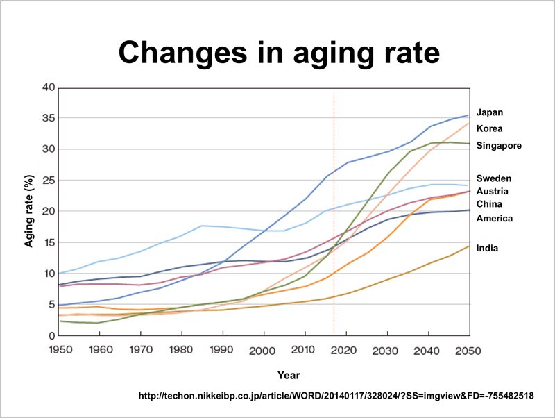 今年 1 月 25 號來台參加 2018 龍吟趨勢論壇的日本國立長壽醫療研究中心(NCGG)院長荒井秀典教授,正是了解整個過程以及高齡醫學的專業工作者,他在「高齡者身心強化之國家具體實踐」演講中提到台灣的人口結構將跟上日本步入超高齡社會,有些經驗或許可以提供台灣參考。