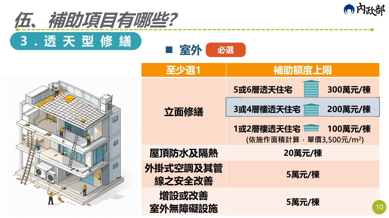 透天型修繕室外部分必選1項,項目為「立面修繕」依樓層高度最高補助300萬元、「屋頂防水及隔熱」每棟補助上限20萬元、「外掛式空調及其管線之安全改善」每棟補助上限5萬元、「增設或改善室外無障礙設施」每棟補助上限5萬元。