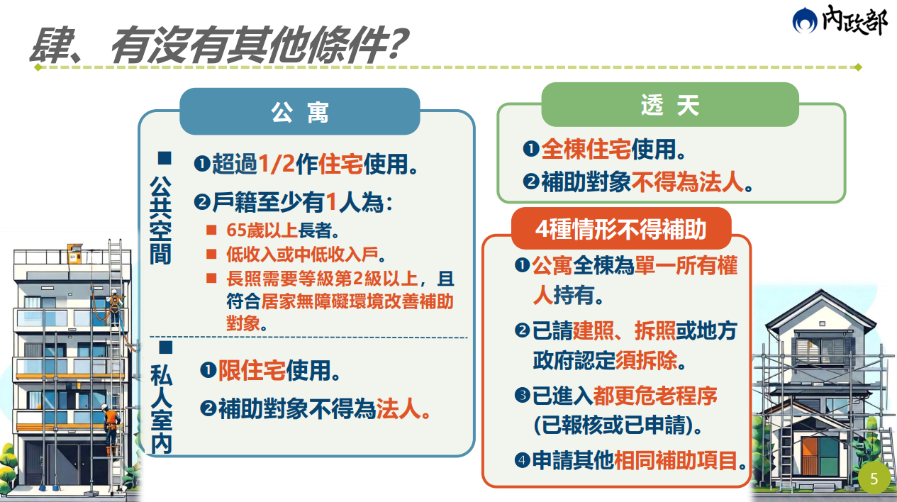 依內政部規畫,30年以上合法的4到6層公寓、6層以下透天厝可以申請,其中公寓必須超過1/2為住宅,戶籍至少有1人為65歲以上長者、低收戶或中低收入戶、長照需要第2級以上等,透天厝則要全棟皆為住宅使用。