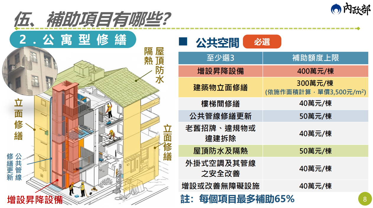 公寓型補助中,,公共空間必選至少3項,項目及每棟補助上限為「增設昇降設備」400萬元、「建築物立面修繕」300萬元、「樓梯間修繕」40萬元、「公共管線修繕更新」50萬元、「老舊招牌、違規物或違建拆除」40萬元、「屋頂防水及隔熱」50萬元、「外掛式空調及其管線之安全改善」40萬元、「增設或改善無障礙設施」40萬元,且每個項目最多補助65%。