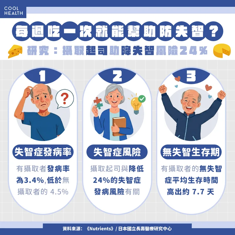 隨著全球高齡化社會來臨,「失智症 」問題已成為各國公衛體系眼中的燙手山芋。據世衛組織(WHO)統計,2021年全球失智人口超過5000萬,預計到2050年將增長至三倍以上。在失智症目前仍缺乏有效治癒手段的情況下,如何透過「飲食」等可改變的生活因子,來預防認知退化,成為醫學界關注的焦點。近期刊登於《Nutrients》的最新日本世代研究指出,對於社區中的高齡長者而言,每週攝取至少一次起司 ,可能有助於降低罹患失智症的風險。